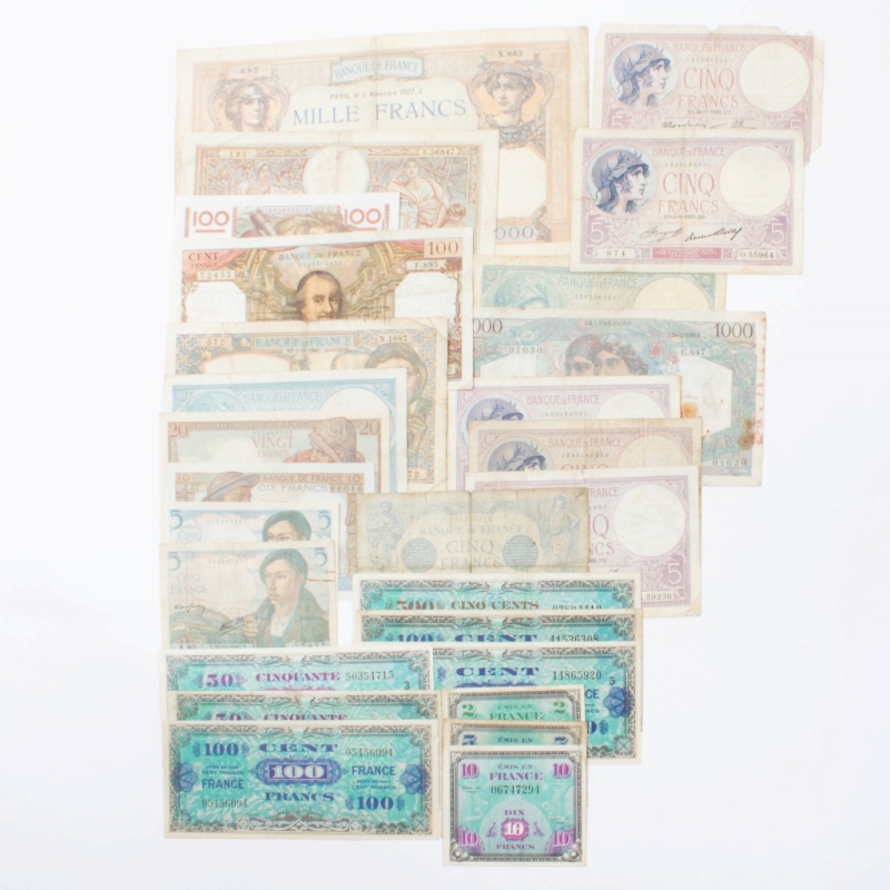 1000 Francs (2), 5.11.1927, 20.4.1950 ; 100 Francs (3), 30.12.1937, 2.11.1951, 6.11.1975 ; 20 Francs (2), 5.12.1940, 24.9.1942 ; 10 Francs (3), 24.12.1931, 16.1.1941, 9.9.1943 ; 5 Francs (8), 15.12.1915, 9.3.1933, 8.6.1933, 20.7.1939, 27.7.1939 (2), 2.6.1943, 25.11.1943 ; Emission monétaire des alliés: 500 Francs Drapeau ; 100 Francs (FRANCE, Drapeau) ; 50 Francs (2), Drapeau, FRANCE ; 10 Francs Drapeau, 5 Francs Drapeau; 2 Francs Drapeau.
