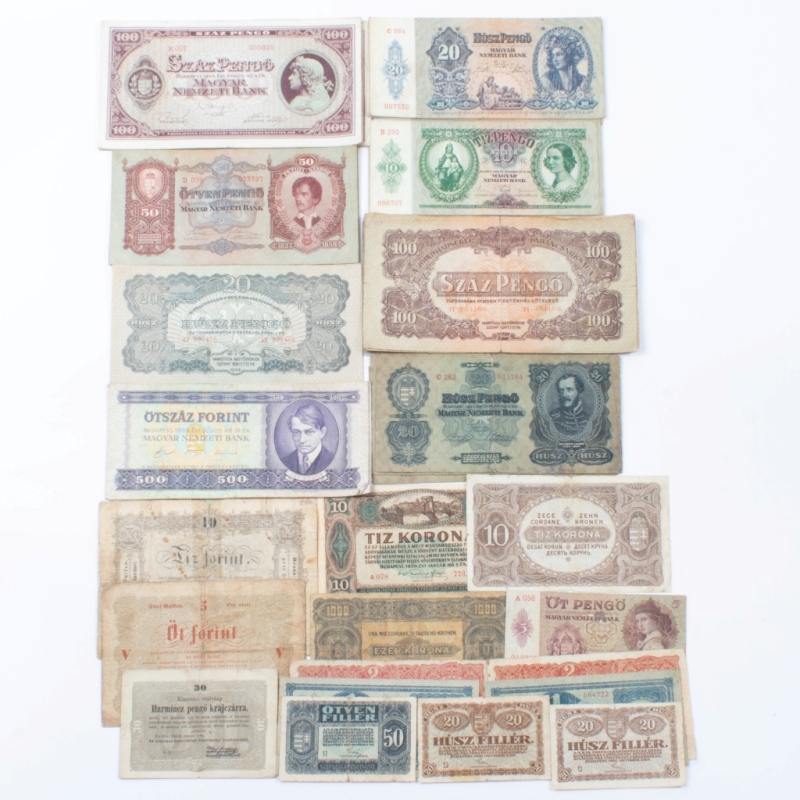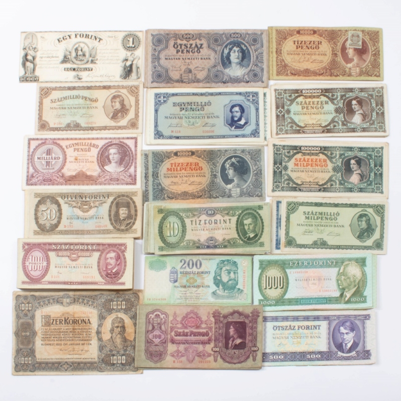 10 Forint, 1.9.1818 ; 5 Forint, 1.9.1818 ; Forint, (1852) non émis ; 30 Pengo Krajczar, 1.1.1849 ; 1000 Korona, 1920 (2) ; 1000 Pengo, 24.2.1953 (2) ; 100 Pengo, 1.7.1930 (16), 5.4.1945 (6) ; 50 Pengo, 1.10.1932 (5) ; 20 Pengo, 15.1.1941 (7) ; 10 Pengo, 22.12.1936 (10) ; 5 Pengo, 25.10.1939 ; avec des émissions en Pengo, émissions de l'occupation de l'armée russe, 1944.