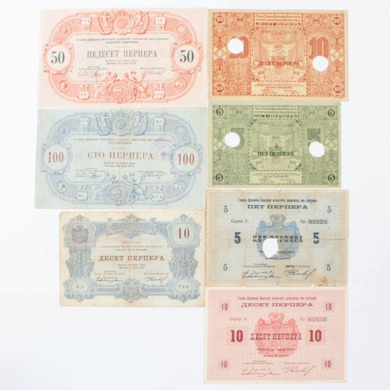 10 Perpera, 1.10.1912, annulé ; 5 Perpera, 1.10.1912, annulé ; Royal government, 2e émission, 10 Perpera, 25.7.1914 ; 5 Perpera, 25.7.1914 annulé ; 3e émission, 100 Perpera, 25.7.1914 ; 50 Perpera, 25.7.1914 ; 10 Perpera, 25.7.1914 (Pick 3b, 4b, 9, 10, 18, 20, 21).
