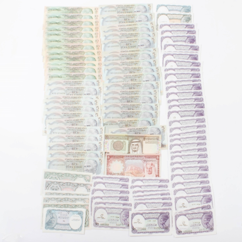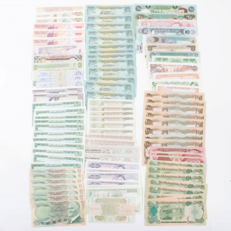 Afghanistan, 1000 Afghanis, SH1370 (8) ; 500 Afghanis, SH1369 (7), SH1370 ; Arabie saoudite, Riyal (2), 1977, 1984 ; Egypte, 10 Piastres, (1997-98) ; 5 Piastres (1971) sign. Hamed (46), (1997-1998), (1998) (5) ; Iran, 50 Rials, sign.6 ; 20 Rials, sign. 16 ; Iraq, 20 Dinars (2), 1982, 1986, Dinar (2), 1973, 1979 ; 1/2 Dinar, 1973 ; 1/4 Dinar, 1959 ; Liban, 10 Livre, 1986 (2) ; 5 Livres, 1986 (11) ; Oman, 100 Baisa, 1994/1414 ; Qatar, Riyal, (1996) ; Syrie, 5 Pounds, 1991 ; Turquie, 20000 Lira, 1995 (3) ; 10000 Lira, 1982 ; 5000 Lira, 1985 (2), 1990 ; 1000 Lira, 1986 (5) ; 20 Lira, 1974 (2) ; Yemen, 20 Rials, 1985 sign. 8, etc.