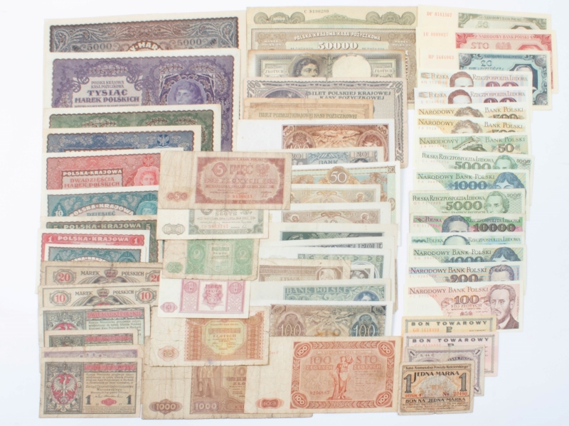 50000 Marek, 1922 ; 10000 Marek, 1922 ; 5000 Marek, 1920 (2) ; 1000 Marek (2), 1916, 1919 ; 500 Marek, 1919 ; 2e émission de 1917: 20 Marek, 10 Marek, 2 Marki, Marka, 1/2 Marki ; 100 Marek, 1919 ; 20 Marek (2), 17.5.1919, 23.8.1919 ; 10 Marek, 1919 ; 5 Marek, 17.5.1919 ; Marka, 1919 (2) ; 1/2 Marki, 1920 ; 1000 Zlotych, 15.1.1946 ; 500 Zlotych, 28.2.1919 ; 100 Zlotych (3), 9.11.1934, 1947, 1.7.1948 ; 50 Zlotych (2), 1.9.1929, 1.7.1948 ; 20 Zlotych (3), 1.3.1940 ; 11.11.1936, 1.7.1948 ; 2 Zlote, 26.2.1936 ; avec des coupures des années 1980 ; Bon Tawarowy, 1969: 10 Cents, 2 Cents, etc.