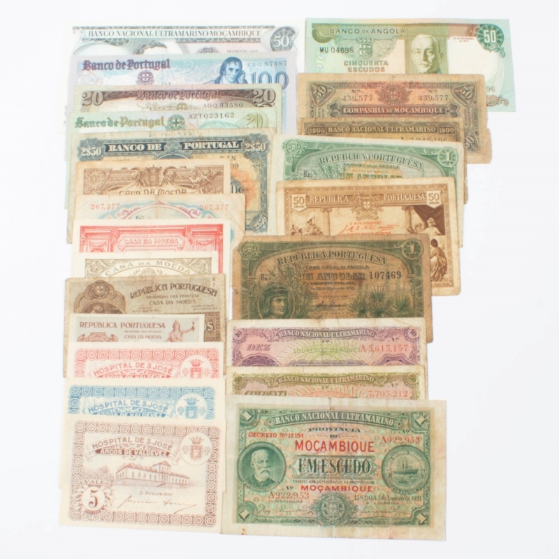 100 Escudos, 12.3.1985 ; 20 Escudos (2), 26.5.1964, 4.10.1978 ; 2,50 Escudos, 18.11.1925 ; Casa de Moeda, 100 Reis, 6.8.1891 ; 5 Centavos, 5.4.1918 (2) ; 20 Centavos, 1925 ; 10 Centavos, 1925 ; Arcos de Valdevez, Hospital de San José, 5, 10, 20 , 50 Centavos ; Angola, Un Angolar (2), 14.8.1926, 28.3.1942 ; 50 Centavos, 1923 ; 50 Escudos, 24.11.1972 ; Mozambique, 50 Escudos, (1976) anc. 27.10.1970 ; Escudo (2), 1.9.1941, 23.5.1944 ; 50 Centavos (2), 5.11.1914 (Pick 61), 1.10.1931 ; 10 Centavos, 5.11.1914 (Pick 59).