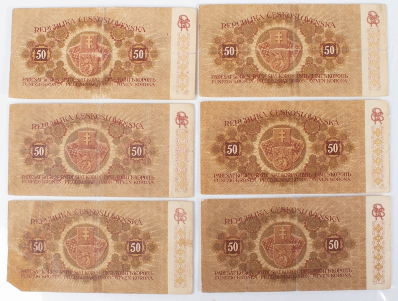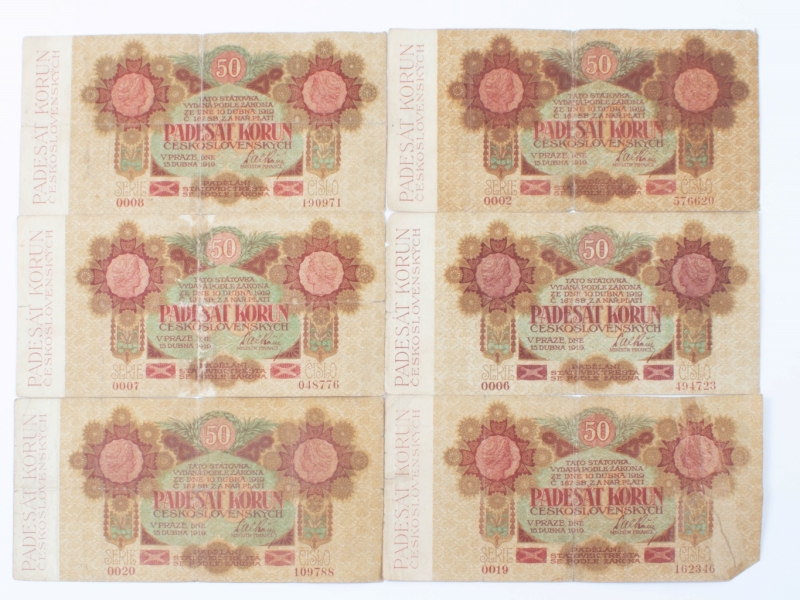 50 Korun, 15.4.1919 (6), série 0002576620, série 0006 n°494723, série 0007 n°048776, série 0008 n°190971, série 0019 n°162346, série 0020 n°109788 (Pick 10).