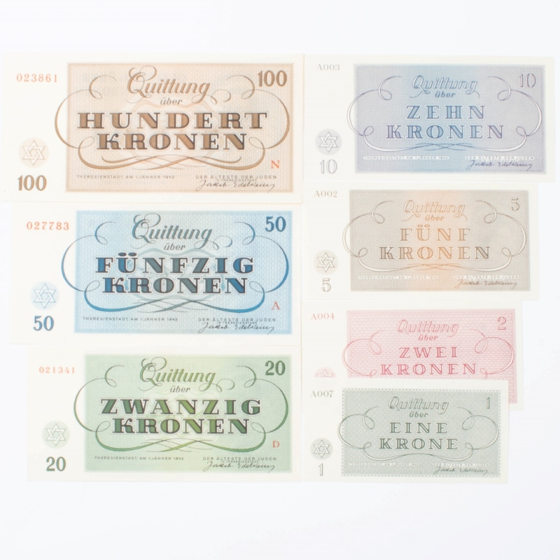1.1.1943 : Krone, A 0072 ; 2 Kronen, A 004 ; 5 Kronen, A 002 ; 10 Kronen, A 003 ; 20 Kronen, D 021341 ; 50 Kronen, A 027783 ; 100 Kronen, N 023861.
