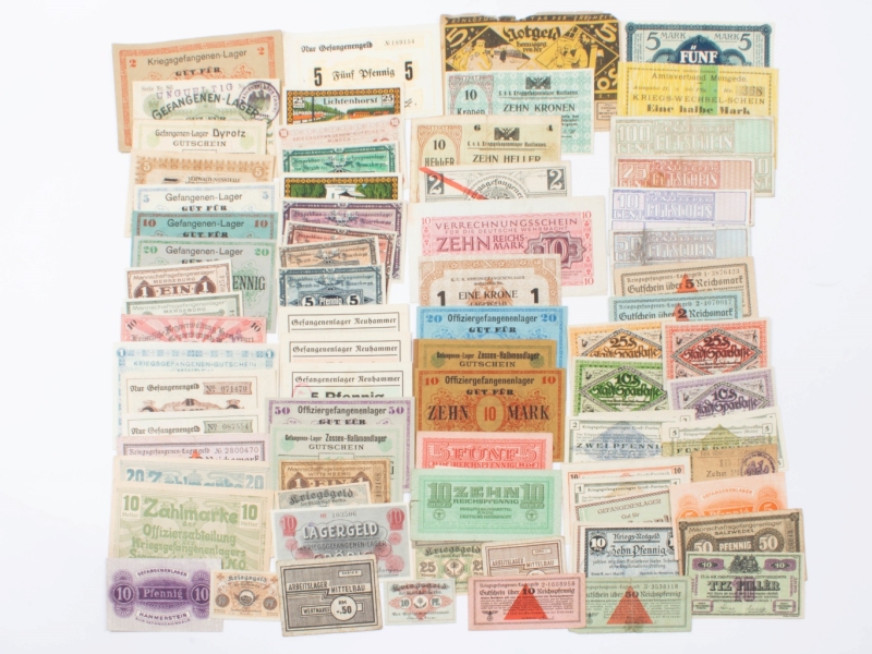 1ere guerre mondiale, Bad Berka, 50, 25, 10 Pfennig ; Bad Blankenburg, 10 Pfennig, 1917 ; Bautzen i. Sa., 2 Mark ; Bielenfeld, Cassel, 2 Mark, tamponné UNGUELTIG ; Chemnitz, 1, 2, 5, 10, 20, 50 Pfennig ; Clausthal, Offizier gefangenenlager, 5 Mark, décembre 1917 ; Diedenhofen, 5 Mark ; Dyrotz, 1915-1918 : 50 Pfennig (coin coupé), 5 Pfennig (coin coupé) ; Friedrischsfeld, 1, 5, 10 Pfennig ; Golzern, 1, 2, 5, 10 Pfennig ; Gross Poritsch, 1, 2, 5, 10 Pfennig ; Hammerstein, 5, 10 Pfennig ; Langensalza, 2 Mark, 20 Pfennig, 5 Pfennig, ; Merseburg, Pfennig, 1.1.1916, 5 Pfennig, 1.7.1918, 10 Pfennig, 1.7.1918 ; Metz, Kaiserliche Bergvermaltung Homécourt des Gouvernements, 10 Pfennig tamponné ; Neuhammer, 5, 10, 50 Pfennig ; Strasburg, 10 Pfennig ; Quedlinburg, 5 Mark ; Wahmbeck, 10, 20, 50 Mark ; Zossen-Halbmondlager, 5 Pfennig (2), 10 Pfennig ; Autriche, Lagergeld, Krone, 10 Heller ; Mauthausen, 10 Kronen, 10 Heller, 2 Heller ; Signmundsherberg, 20, 10 Heller ; Hongrie, 10 Filler, 1.6.1916 ; 2e guerre mondiale, Allemagne, 1939: 1, 10, 50 Reichspfennig, 1, 2, 5, 10 Reichsmark; 1944: 5, 10 Reichspfennig ; Pays-Bas, Lager Westerbork, 100, 50, 25, 10 Cent.