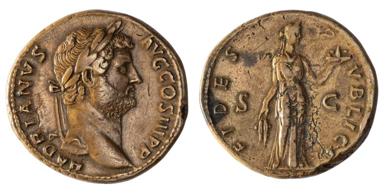 Sesterce, 26,71g, 136, Rome, tête laurée à droite, HADRIANVS AVG COS III P P, rev. Fides debout tenant des épis et une assiette de fruits, FIDES PVBLICA, S - C (RIC 758 ; Sear 3597).
