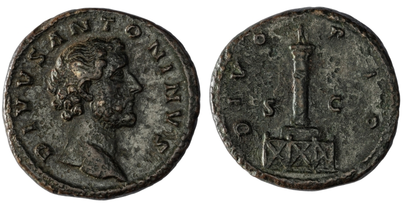 Sesterce, 25,47g, 162 ap. J.-C., Rome, tête nue à droite, DIVVS ANTONINVS, rev. colonne surmontée d'une statue de l'empereur, DIVO PIO (RIC 1269 ; Sear 5199).