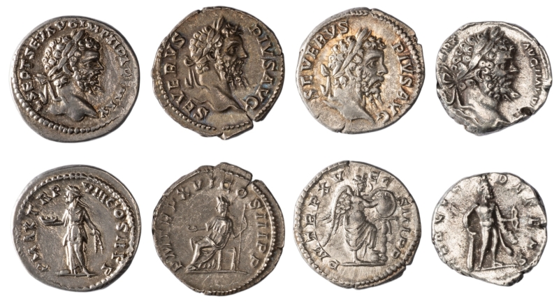 Denier, 2,49g, Rome, 208, tête laurée SEVERVS PIVS AVG, rev. Concordia assise à gauche tenant la patère et un long sceptre, P M TR P XVI COS III P P (S.6344 ; RIC 218 ; RSC 514). Patiné, très beau à superbe ; Denier, 3,29g, tête laurée à droite L SEPT SEV AVG IMP XI PART MAX, rev. Fides debout à gauche tenant un panier de fruits et des épis de blé, P MAX TR P VIII COS II P P (RIC 511a), Très beau ; Denier, 3,41g, Rome, 207, tête laurée à droite, SEVERVS PIVS AVG, rev. Victoire à droite inscrivant sur un bouclier déposé sur un palmier, P M TR P XV COS III PP (S.6340 ; RIC 211 ; RSC 489). Très beau ; Denier, 2,79g, Rome, tête laurée à droite, L SEPT SEV PERT AVG IMP, rev. Hercules debout à droite tenant sa massue, et un arc, HERCVLI DEFENS (S.6284 ; RIC 97 ; RSC 212).