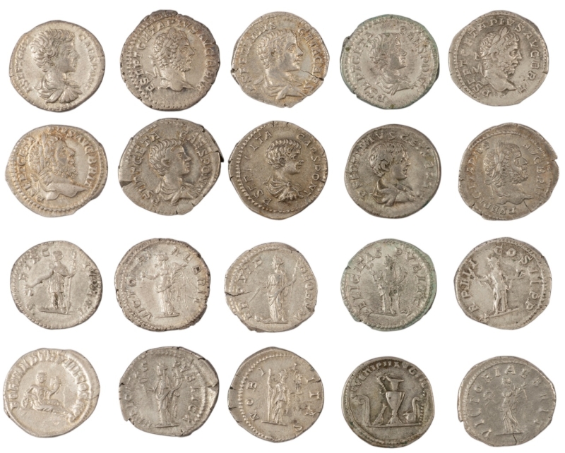 rev. Fortuna, FORT RED TRP III COS II PP ; rev. lituus, SEVERI PII AVG FIL ; rev. NOBILITAS ; rev. PROVID DEORVM.