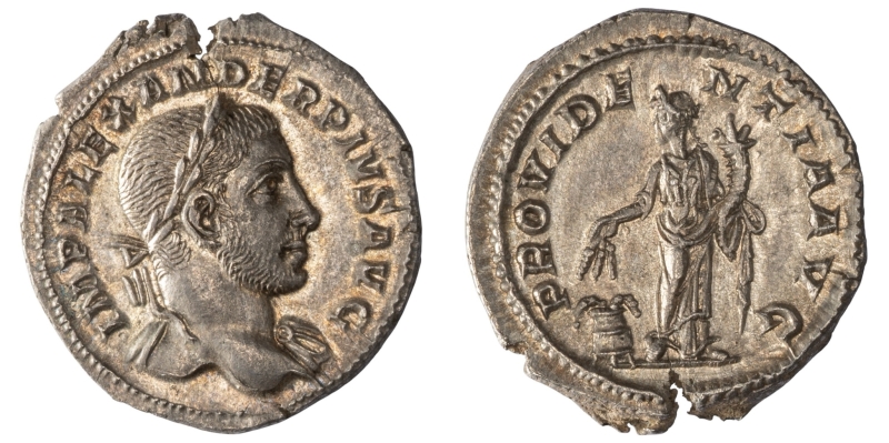 Denier, 2,92g, 231-235,tête laurée à droite, draperie sur l'épaule gauche IMP ALEXANDER PIVS AVG, rev. Providentia debout à gauche, tenant standing left, tenant trois épis de blé et cornucopia, modius à gauche, PROVIDE NTIA AVG (S.7922 ; RIC 250 ; RSC 501).