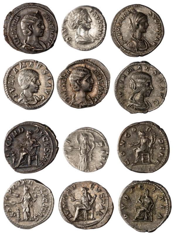 Faustina Senior (décédée 140/1), DIVA FAVSTINA, rev. AETERNITAS ; Plautille (202-205), rev. CONCORDIAE ; Julia Maesa (218-224/5), rev. PVDICITIA ; rev. SAECVLI FELICITAS ; Julia Mamea (222-235), rev. IVNO AVGVSTAE ; rev. FECVND AVGVSTAE.