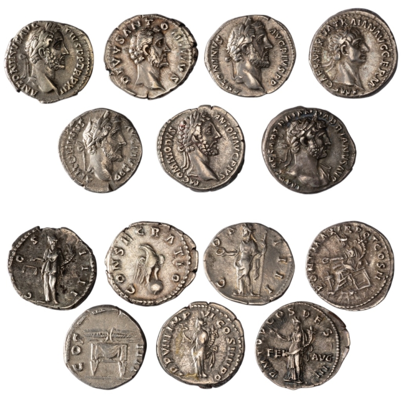Trajan, 3,58g, rev. Concordia assise, PONT MAX TR POT COS II ; Hadrien, 3,24g, rev. Felicitas, PM TR P COS DES III FEL-AVG ; Antonin le Pieux (3), 3,31g, rev. Aequitas, COS IIII ; 3,32g, rev. pulvinar, COS IIII ; 3,06g, rev. Concordia, COS IIII ; 3,39g, rev. aigle, sur un globe, CONSECRATIO ; Commode, 3,50g, rev. Felicitas, TRP VIII IMPVI COS IIII PP.