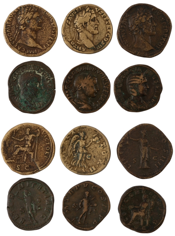 Domitien, Sesterce, 25,31g, rev. IOVI VICTORI ; Antonin le Pieux (2), Sesterce, 26,02g, rev. LIBERTAS COS IIII ; Sesterce, 21,50g, rev. Victoire, IMPERATOR II ; Otacilia Sevère, Sesterce, rev. 22,06g, rev. CONCORDIA AVGG ; Gordien III (2), Sesterce, 17,15g, rev. P M TR P VI COS II PP ; Sesterce, 21,60g, rev. AETERNITATI AVG.