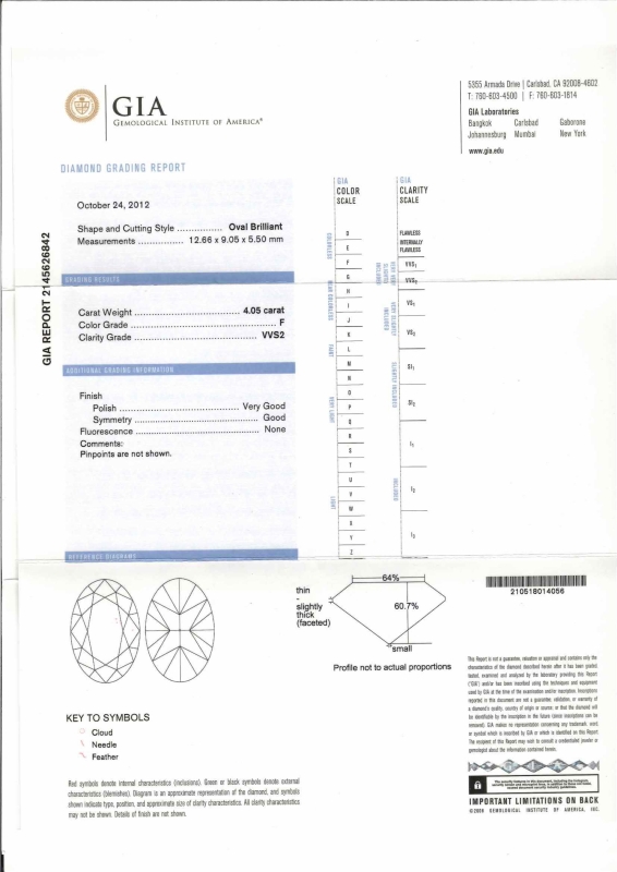 GIA, October 24, 2012 - report n°2145626842 - 4,05 ct F VVS2
