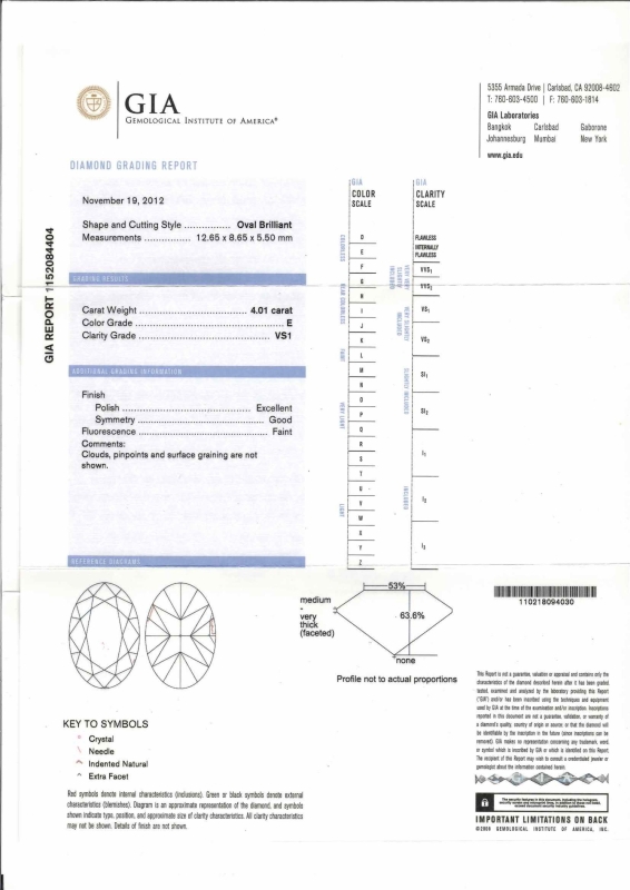 GIA, November 19, 2012 - report n°1152084404 - 4,01 ct E VS1