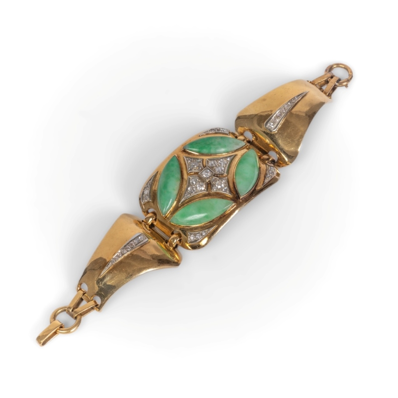 En or jaune 18K (750) articulé en trois parties reliées par des agrafes, arborant au centre des éléments de jadéite taillés en forme de feuilles soulignés de diamants de tailles diverses : rose, ancienne et brillant. les deux autres mailles sont également rehaussées de diamants.