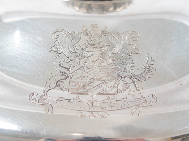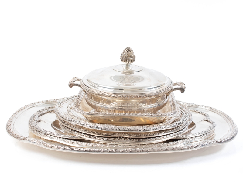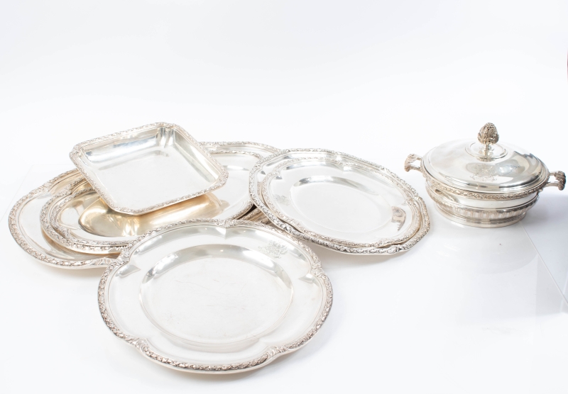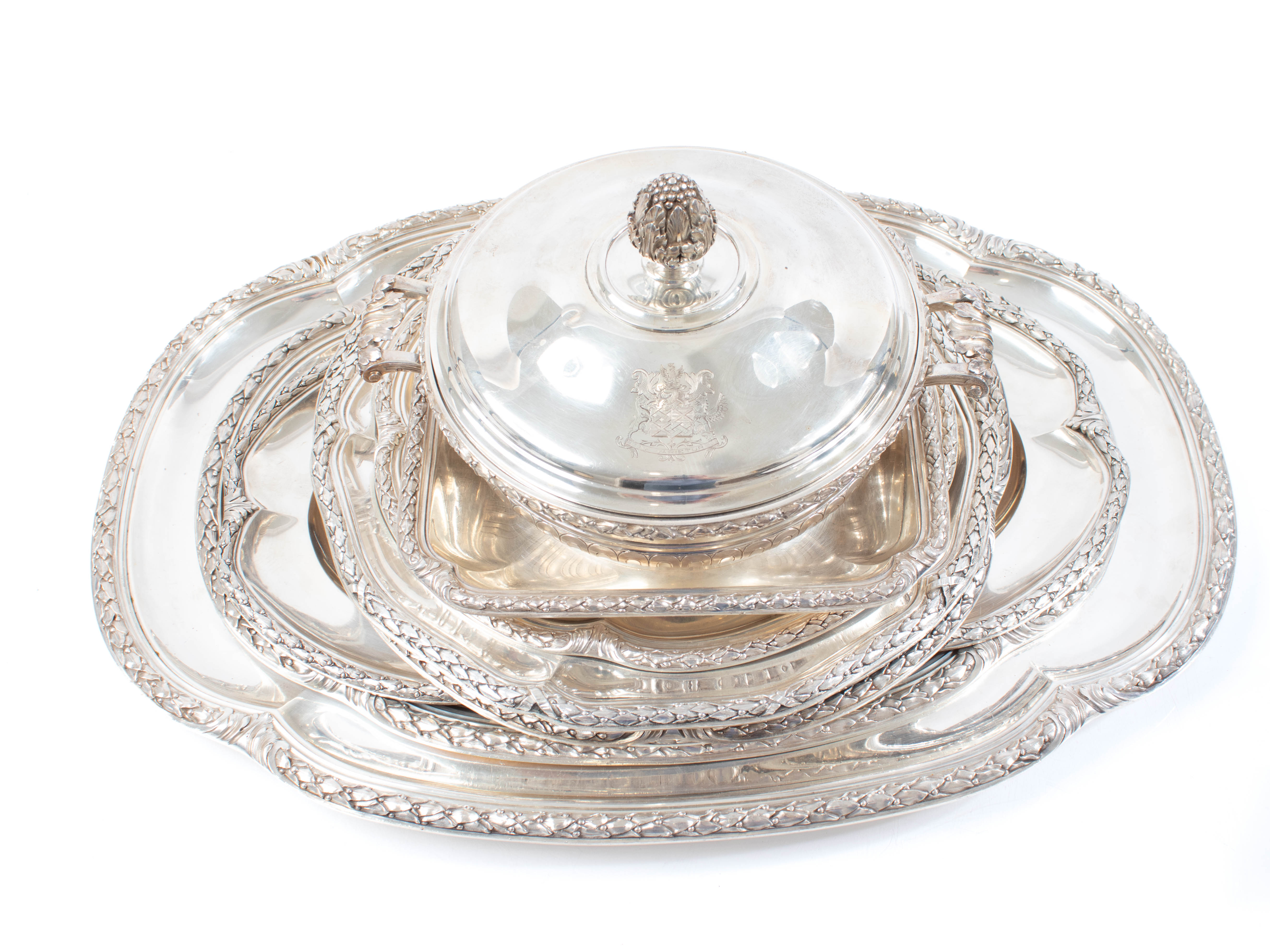 en argent à motif guirlande comprenant trois plats ovales, quatre plats ronds, une soupières et son couvercle, une corbeille. Poinçons tête de Minerve et M.O