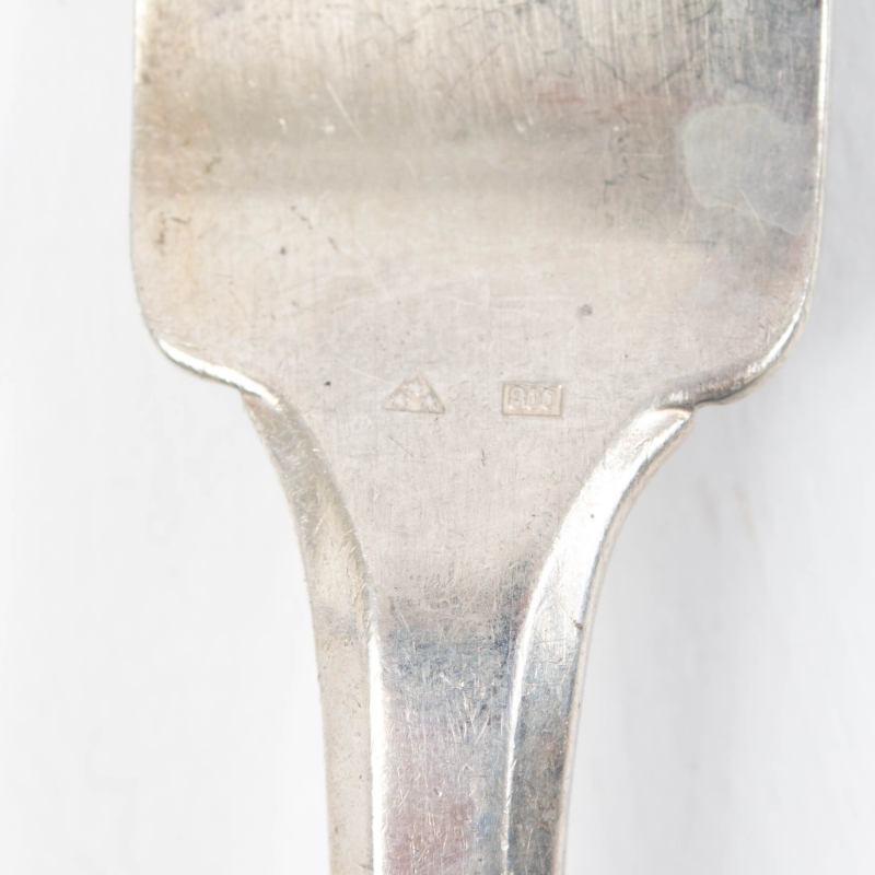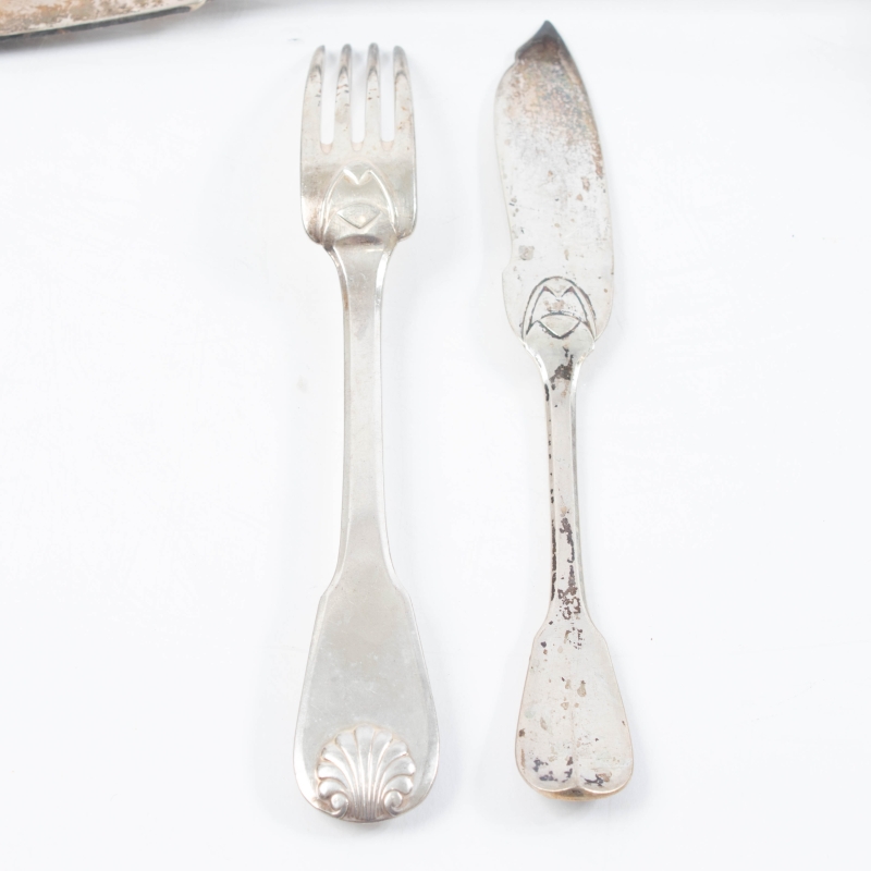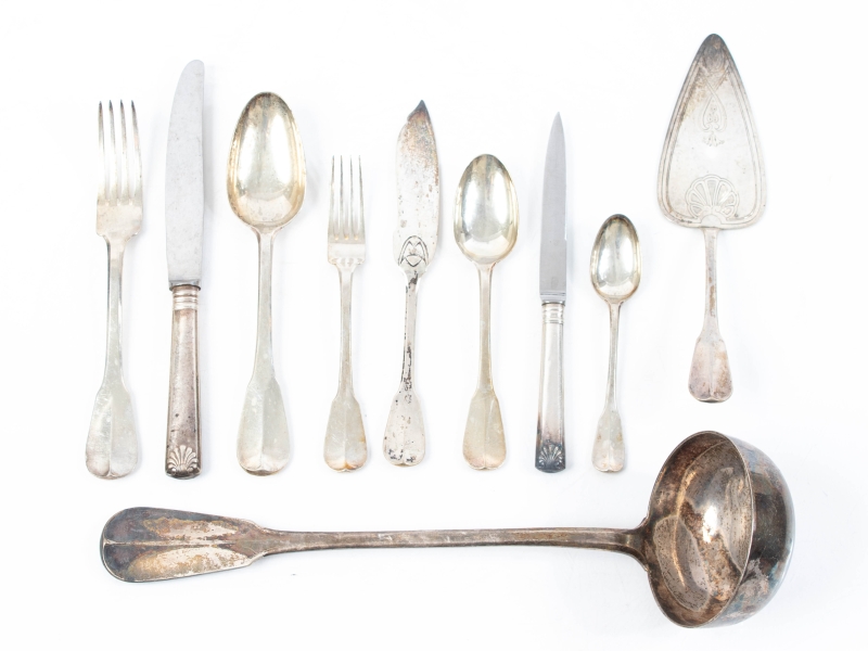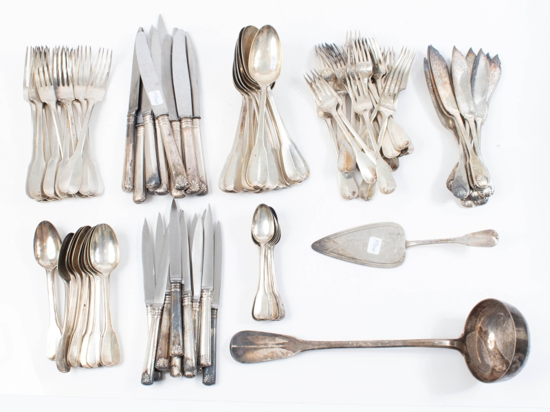 en argent (800) comprenant : 10 grands couteaux (922 gr bruts), 12 grandes fourchettes (1138 gr), 12 grandes cuillères (1354,7 gr), 11 couteaux à poisson (723,4 gr.), 22 fourchettes à entremets (1233,7 gr), 12 couteaux à fruits (665,5 gr. bruts), 12 cuillères à entremets (705 gr), 10 cuillères à thé (318,2 gr), une louche (408,2 gr), une pelle à tarte (93,9 gr). Poinçons 800 et M.O