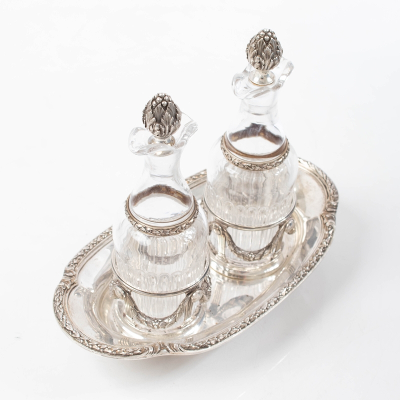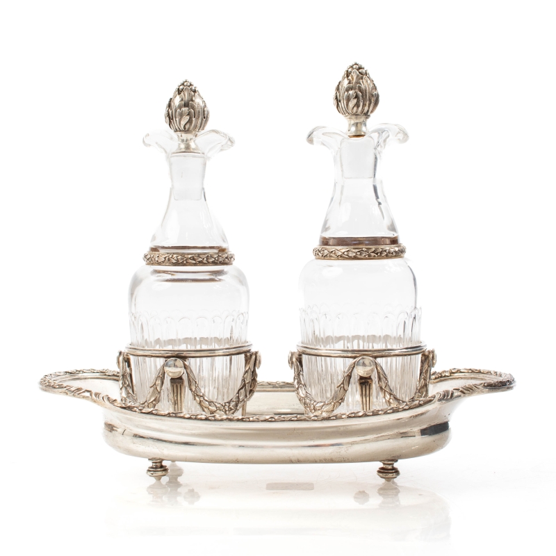 en argent et cristal à décor de guirlande. Poinçons M.O et tête de Minerve. Carafe à bouchons en cristal et argent et bagues en argent.