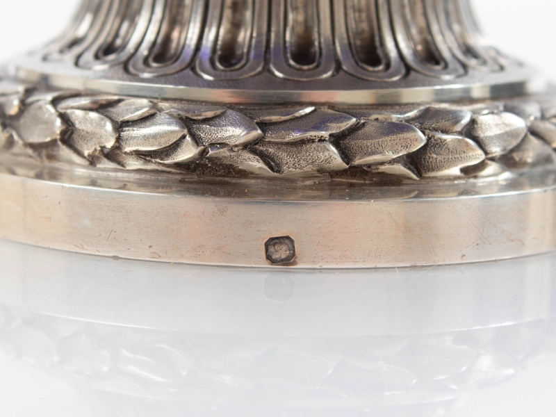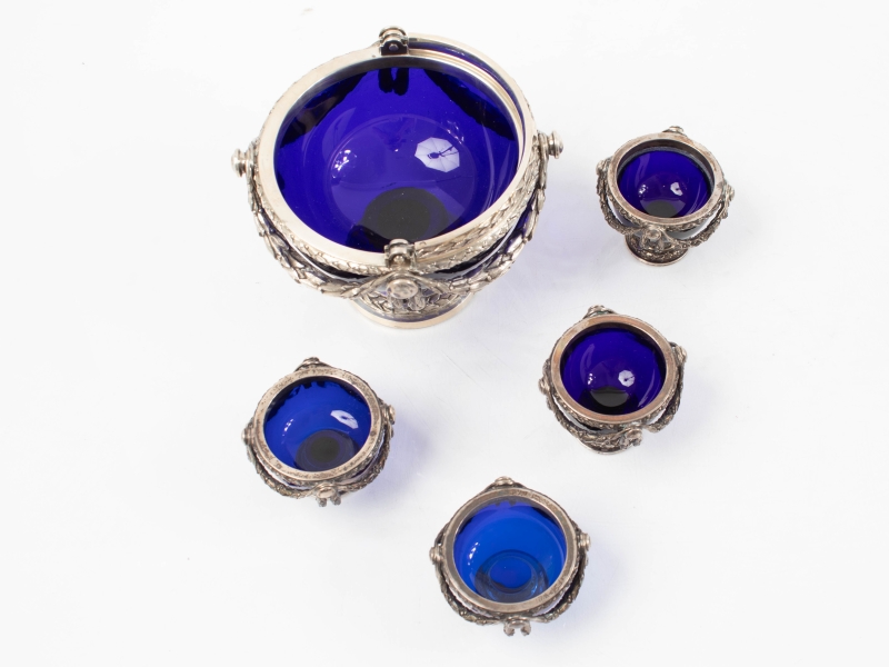 en argent et verre bleu comprenant quatre salières et un sucrier. Poinçon M.O et tête de Minerve