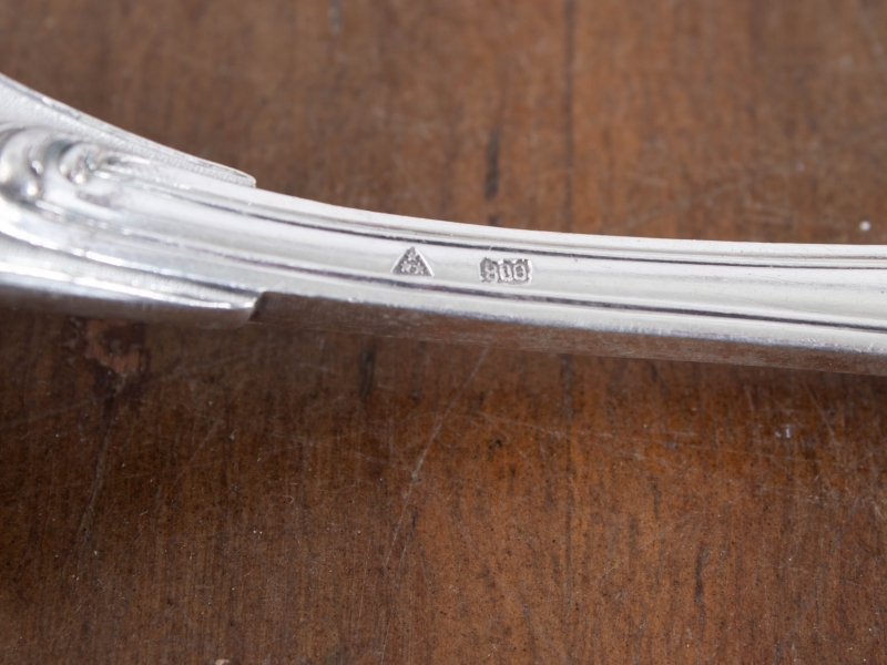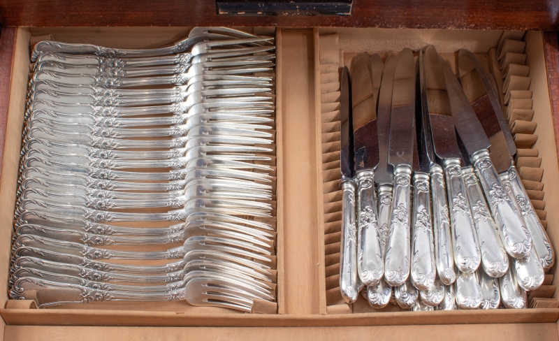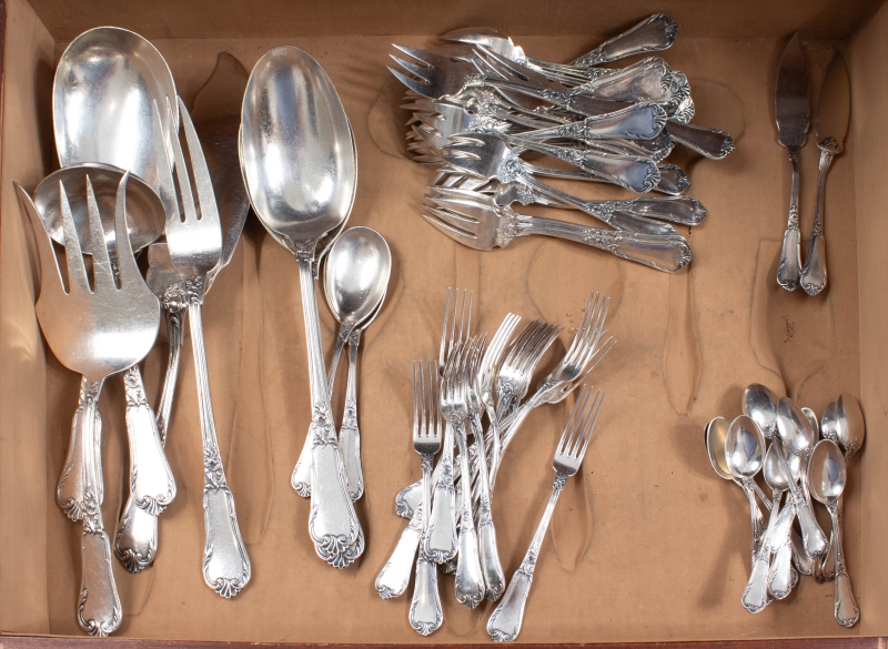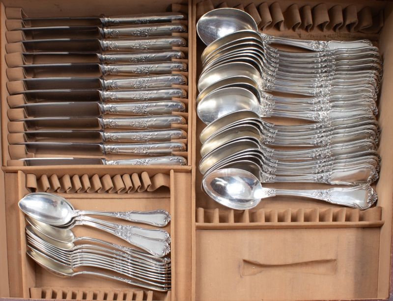 en argent, comprenant 24 grandes fourchettes (1894 gr.), 24 grandes cuillères (2137 gr.), 12 fourchettes à poissons (580,5 gr.), 12 couteaux à poissons (775 gr), 12 fourchettes à salade (541 gr), 12 cuillères à entremets (633,6 gr), 12 cuillères à thé (318 gr), 12 couteaux à fruits (362,4 gr). Sont compris au même modèle en argent 800 mais non poinçonnés par Wolfers : 24 grands couteaux (1893 gr. bruts), 12 couteaux à entremets (595,7 gr. Bruts).