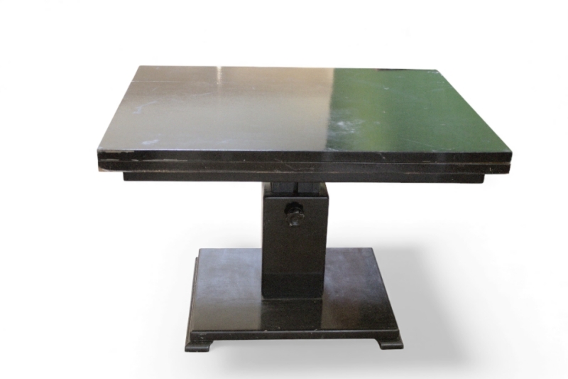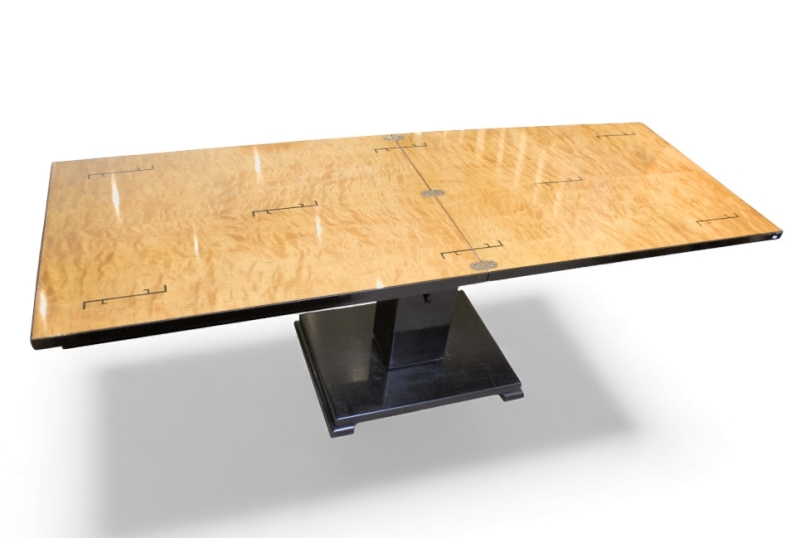 Table Art Déco à transformations en bouleau et laque noire à décor marqueté sur le plateau. Utilisable en table basse, console ou table de salle-à-manger.