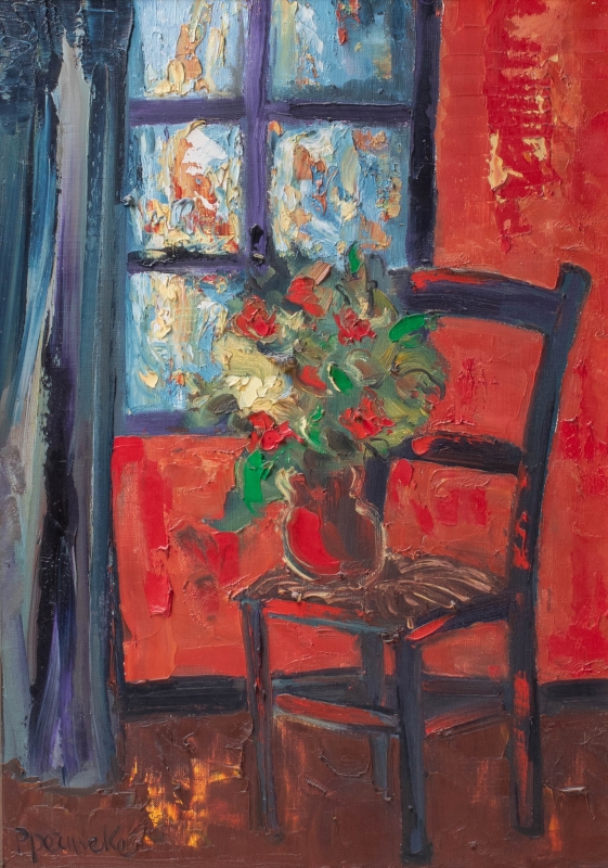 Composition à la chaise et au vase de fleurs sur fond rouge