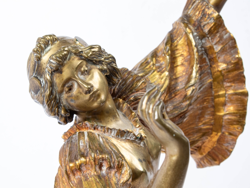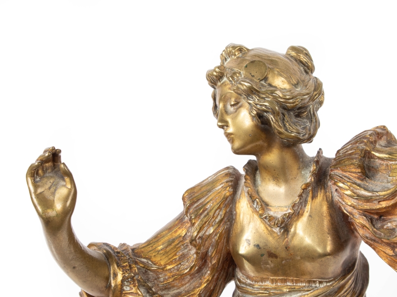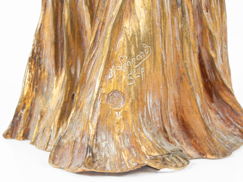 Note : En 1898, la Manufacture Nationale de Sèvres commande à Agathon Léonard un surtout de table en biscuit, qu'elle présentera à l'Exposition Universelle de 1900 à Paris. Remportant un vif succès, cette composition figurait un "Jeu de l’écharpe" et était composée de quinze statuettes représentant des danseuses aux robes plissées. Celles-ci évoquaient les chorégraphies de la célèbre danseuse Loïe Fuller. Les statuettes furent ensuite commercialisées en deux grandeurs par Sèvres puis à partir de 1901, elles furent éditées en bronze par le fondeur parisien Susse Frères.