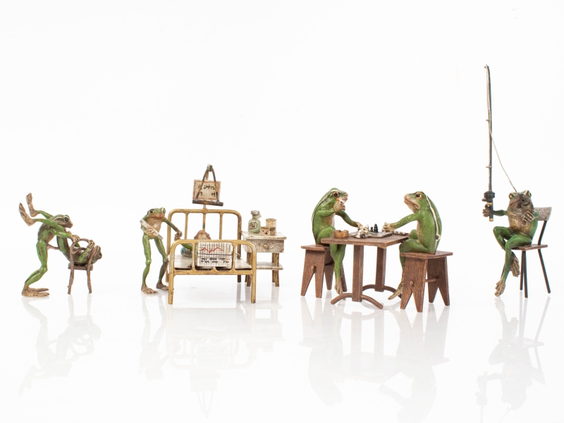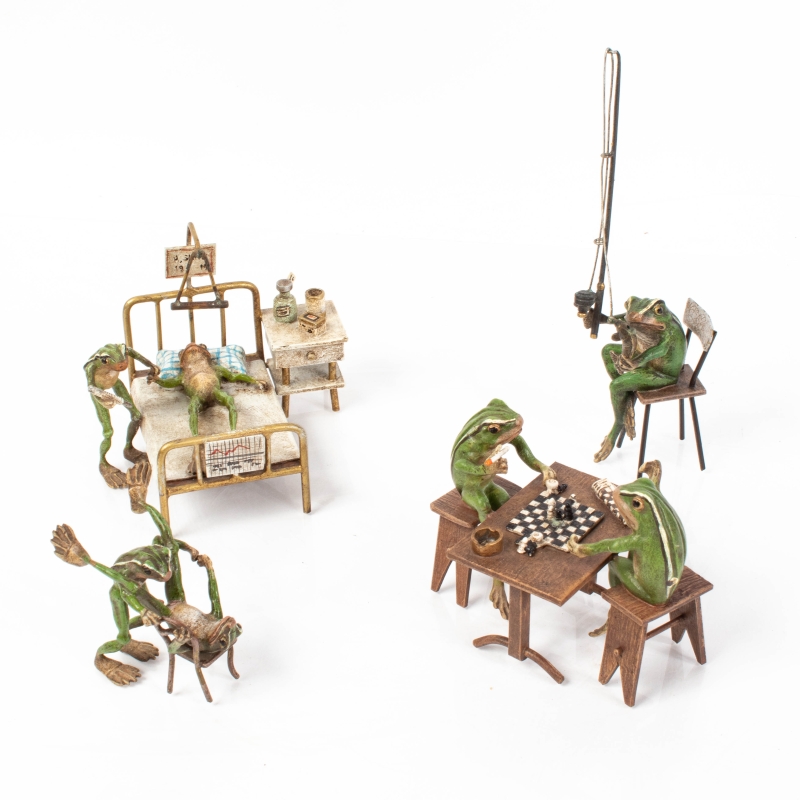 en bronze de Vienne comprenant un couple jouant aux échecs et fumant, une grenouille péchant, une grenouille sur un lit d'hôpital et un infirmier, deux autres s'accouplant. Une monogrammée KK pour Karl Kouba