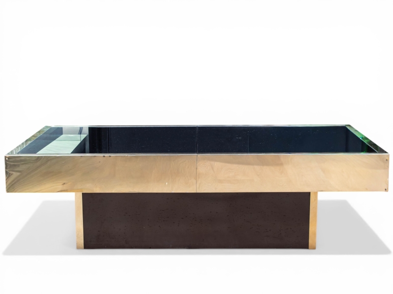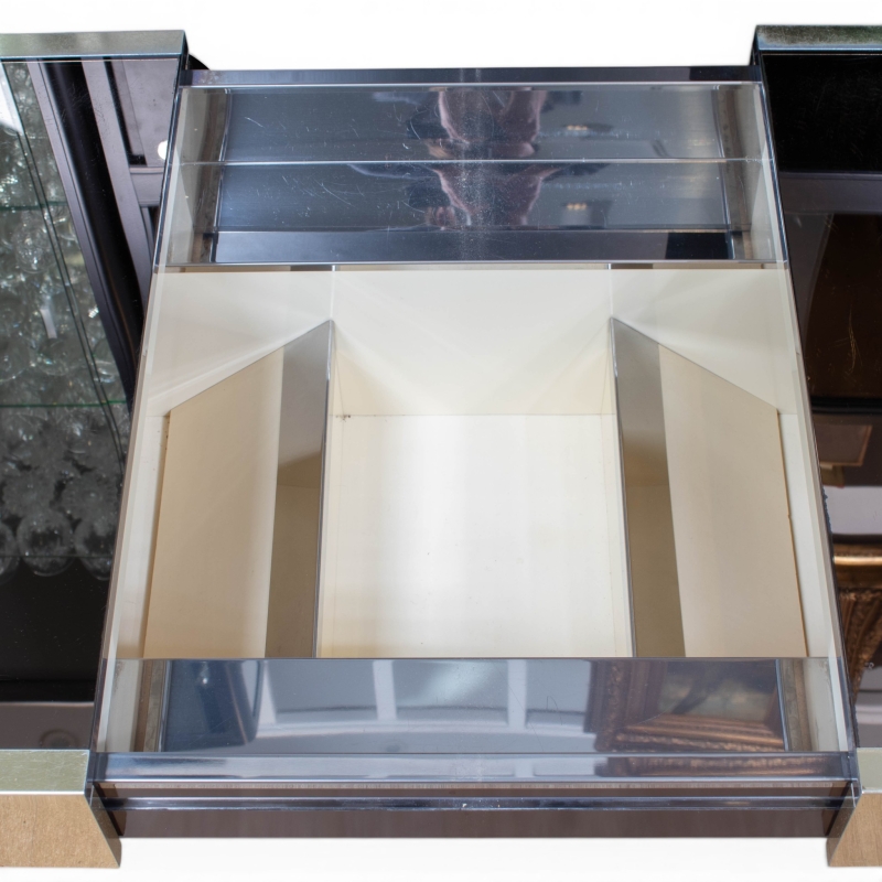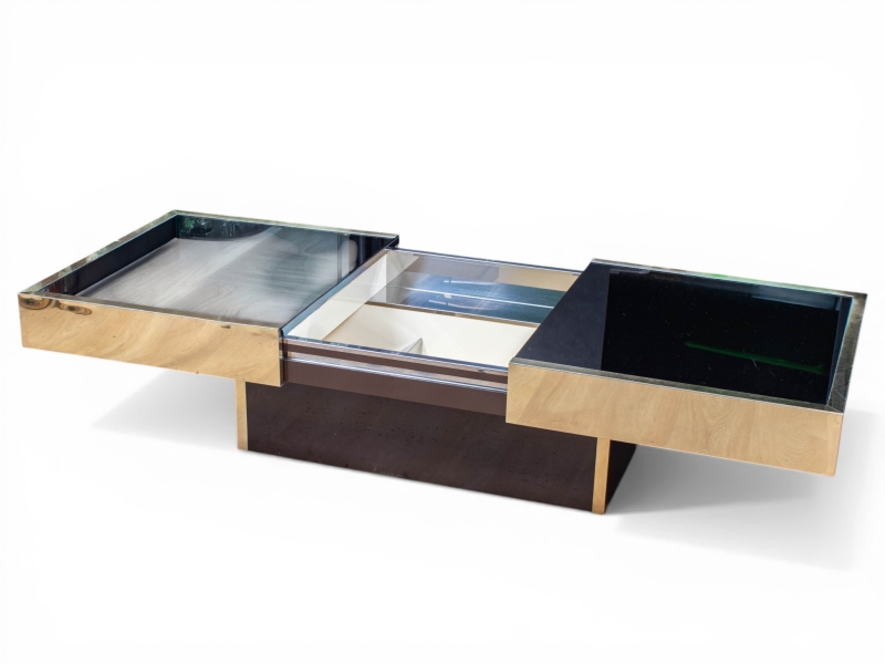 en métal doré et bois laqué noir, le plateau de forme rectangulaire coulissant découvrant en son centre une niche