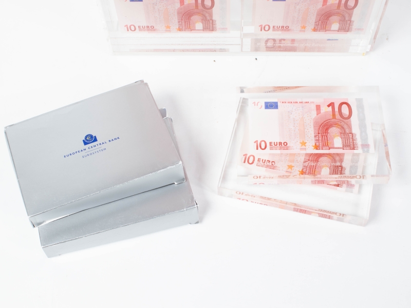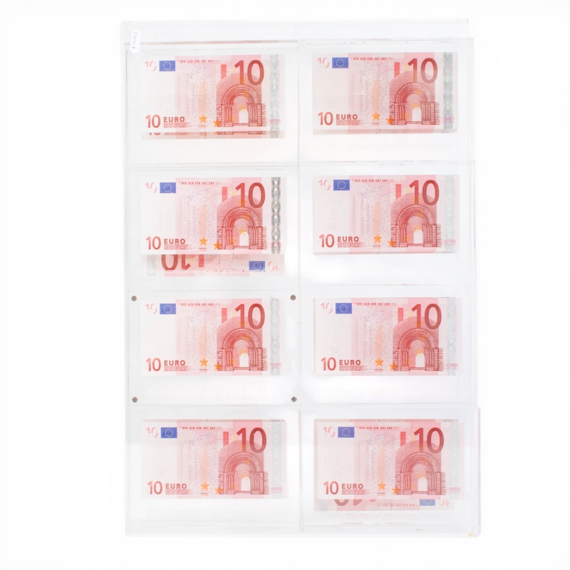 Assemblage de vingt-quatre billets de dix euros dans du plexiglass, chaque bloc marqué.