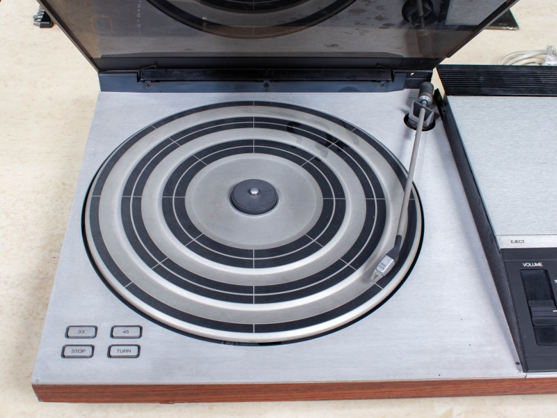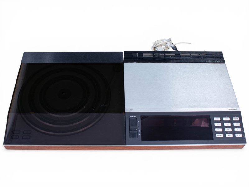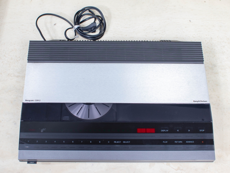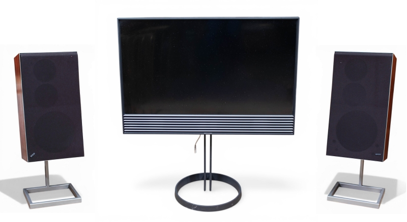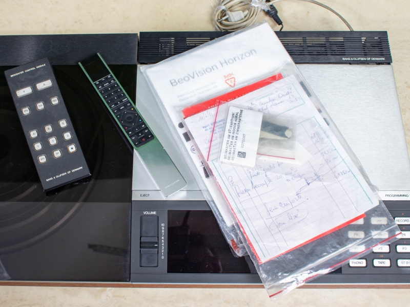 comprenant une platine Beocenter 7002, une paire de baffles sur pied Beovox S45, un lecteur CD Beogram CDX2, un téléviseur Beovision Horizon, la télécommande et la facture (1981).
