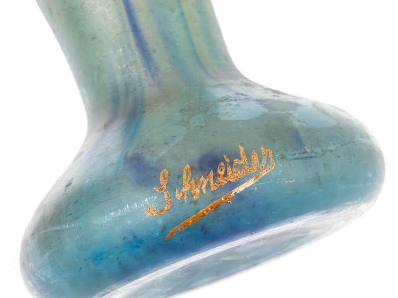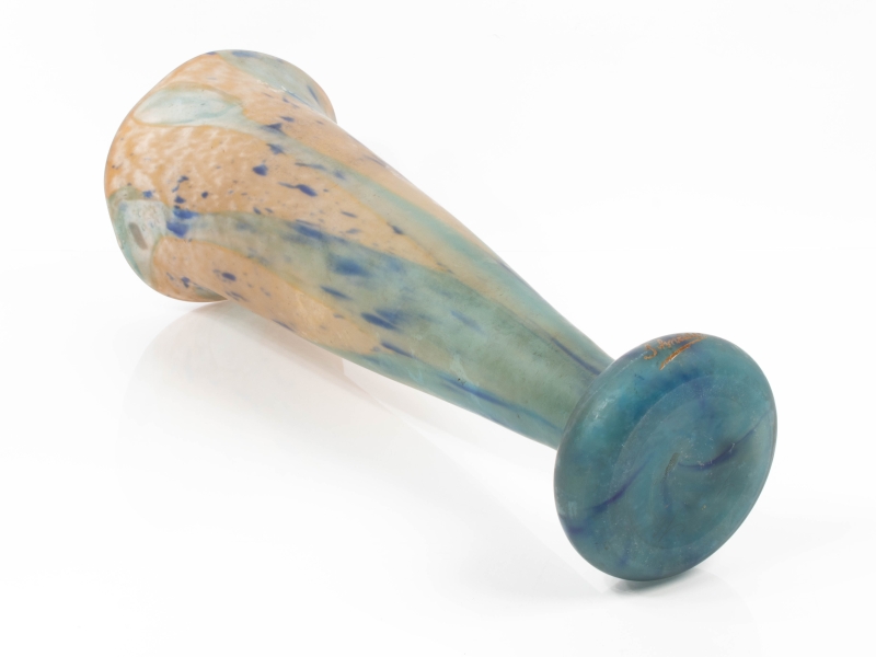 en verre multicouche de couleur bleu ciel et jaune à jaspure bleu marine. Signature émaillée sur le pied.