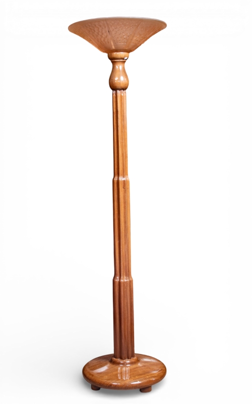 fût en bois sculpté, vasque en verre moulé rose-orangé, signé