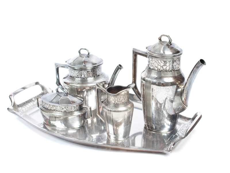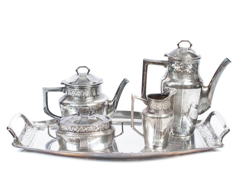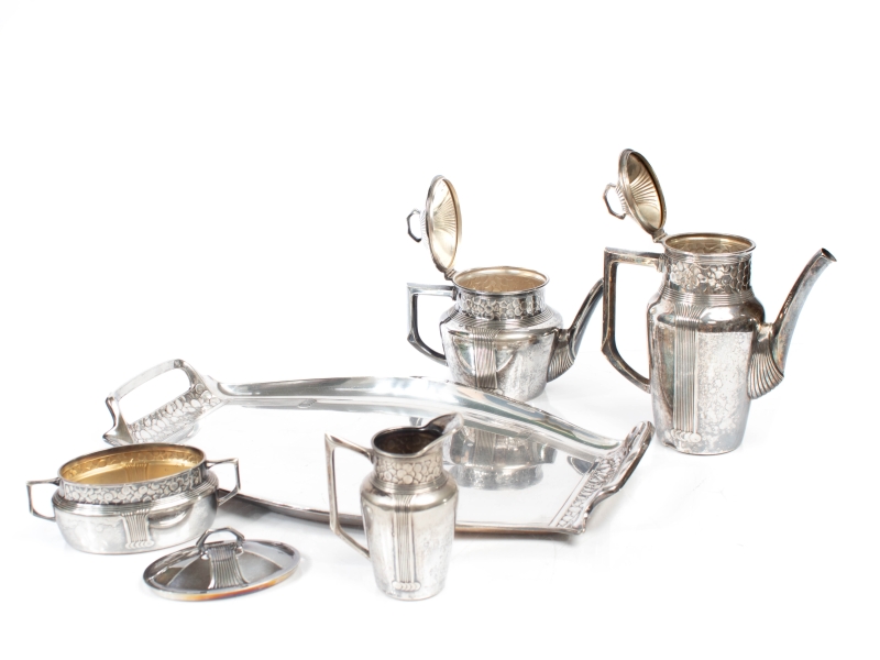 en métal argenté comprenant une théière, une cafetière, un sucrier, un pot à lait et un plateau. Signés