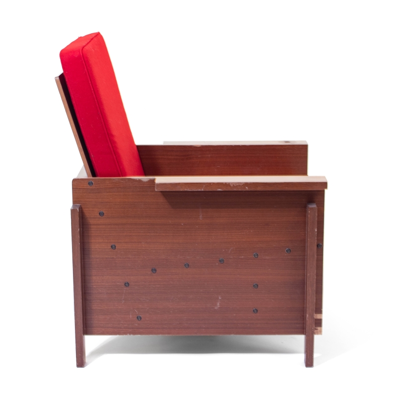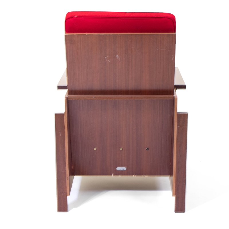 en bois et coussins garni de tissu rouge. Edition Tecno, ABV Collezione vers 1991. Plaque d'éditeur au dos