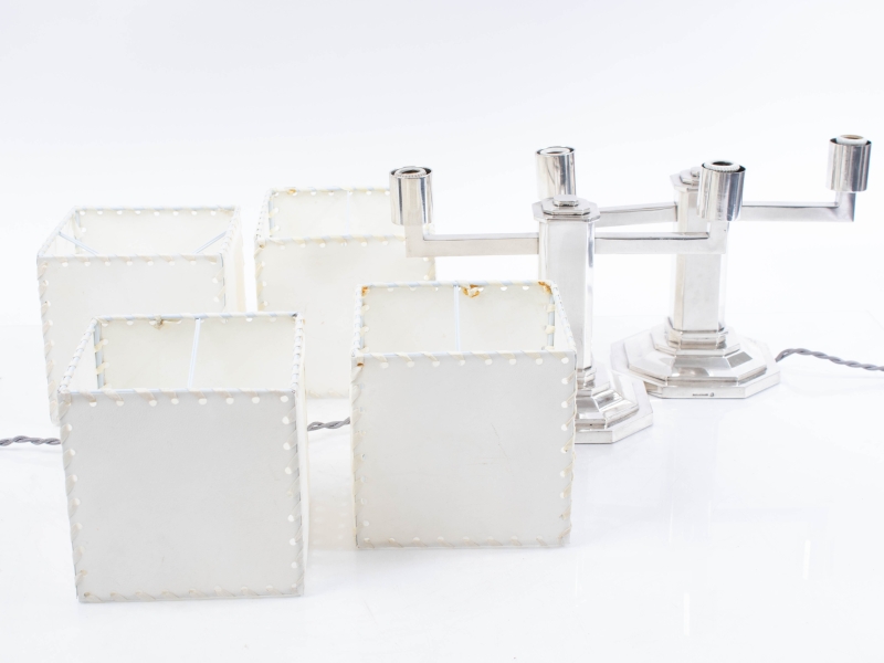 en métal argenté, signé. On y joint des abat-jours blancs