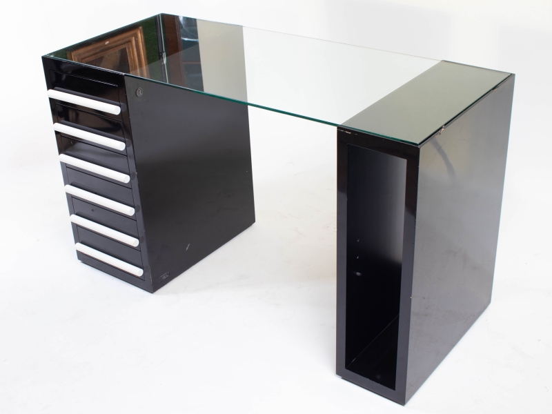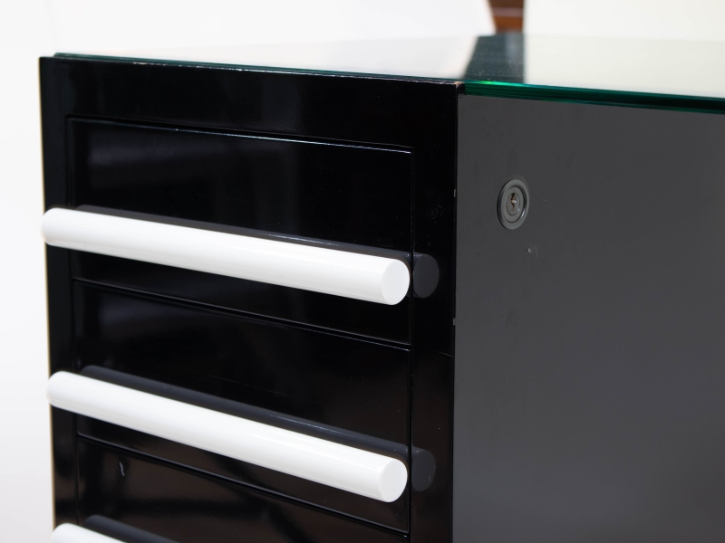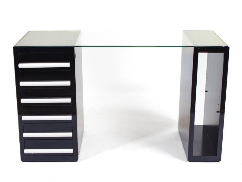 plateau rectangulaire en verre reposant sur deux pieds latéraux en bois laqué noir, l'un composé de six tiroirs à prises laquées blanches et l'autre présentant une niche. Edition vers 1980