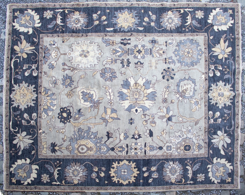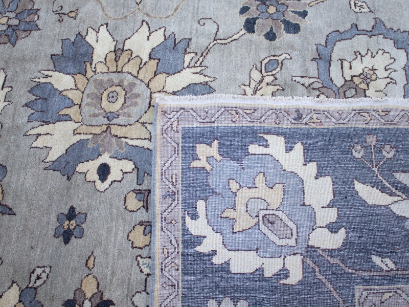 fond chiné gris turquoise, décor de tiges fleuries, bordure bleue de rinceaux de fleurs.