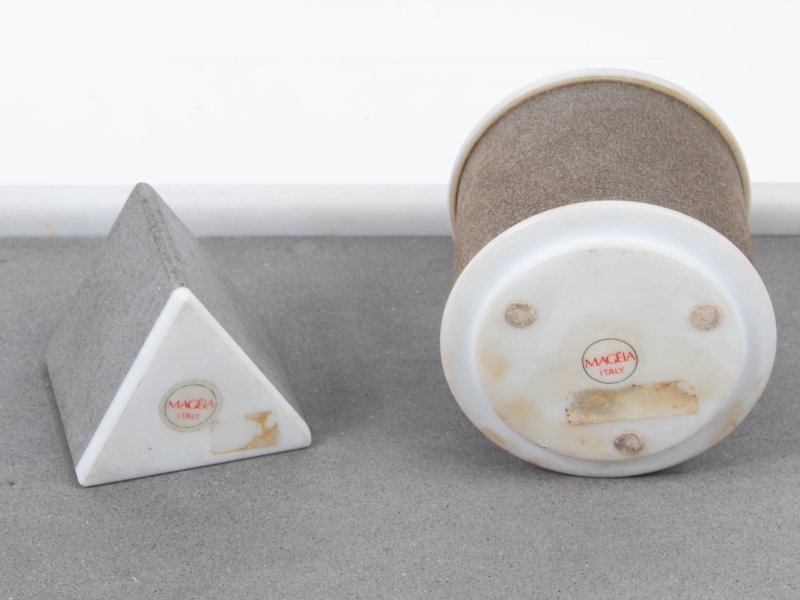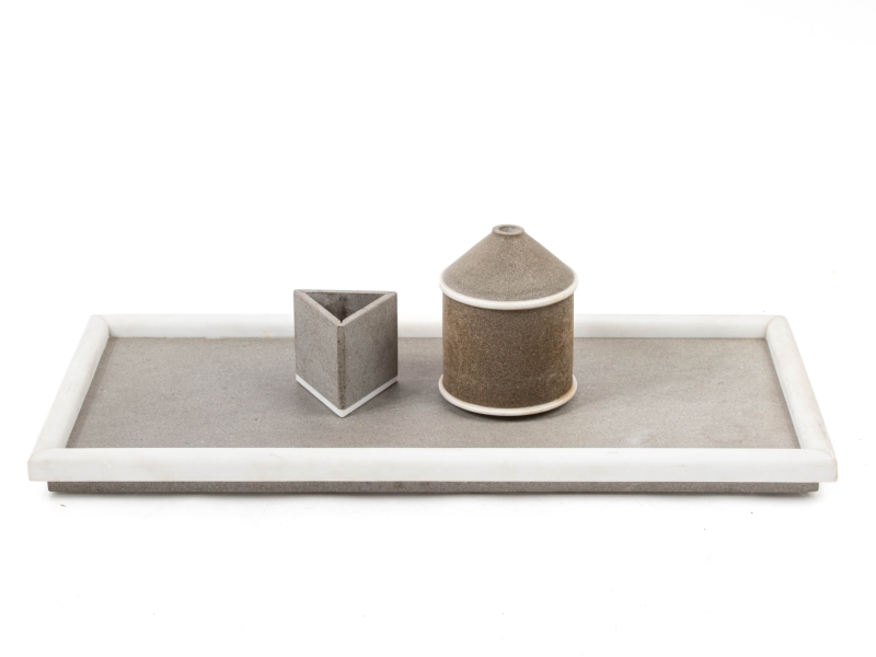 en pierre grise et marbre blanc, comprenant un plateau (25x55 cm), un porte crayon (h: 7 cm) et un soliflore (h: 13 cm)