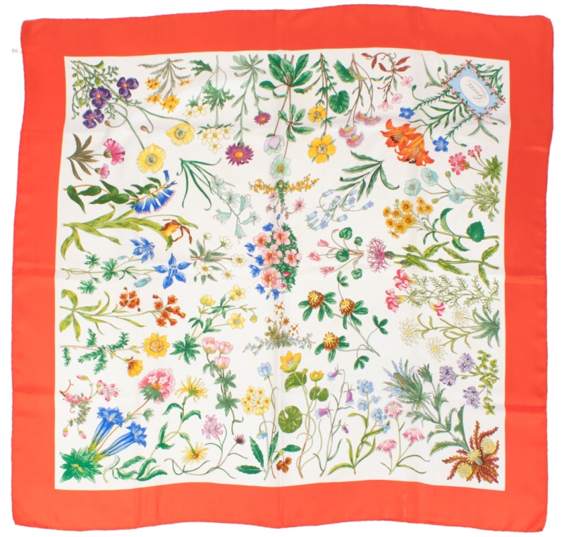 Carré 90 cm en soie twill, fond blanc et entourage rouge, signé Vittorio Accornero de Testa. Carré créé en 1966 en l' honneur à la Princesse Grace de Monaco, commande de Rodolfo Gucci.