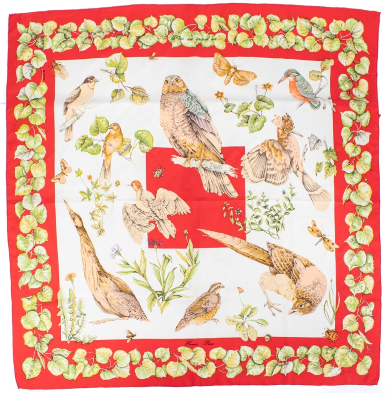 Carré 90 cm en soie twill, fond blanc et entourage rouge, signé Antoine de Jacquelot.