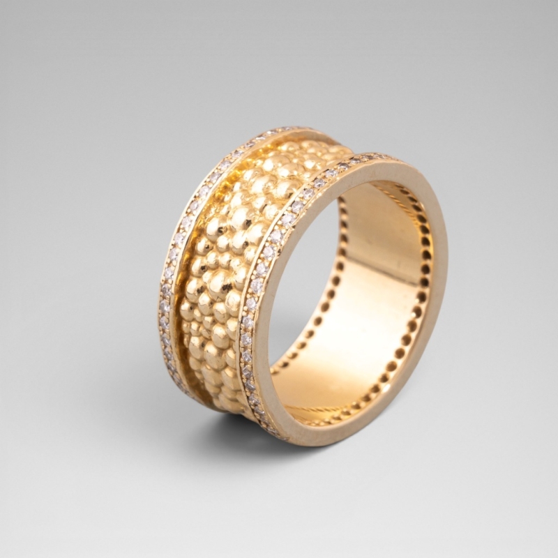 anneau en or jaune texturé bordé de deux rangs de diamants taille brillant.