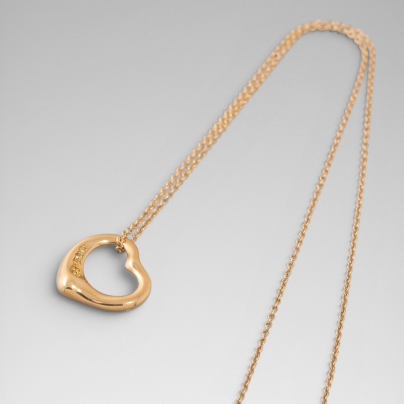 En or jaune 18K (750). Iconique pendentif en forme de cœur stylisé et évidé, modèle " Open heart " dessiné par Elsa Peretti pour Tiffany. Celui-ci serti de cinq diamants jaunes taille brillant soulignant le mouvement asymétrique est une rareté.