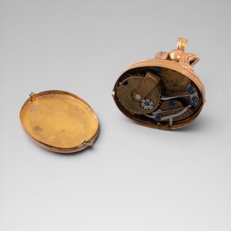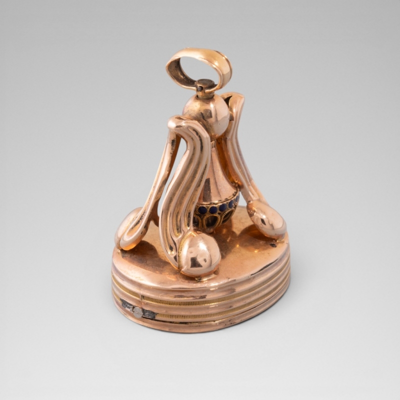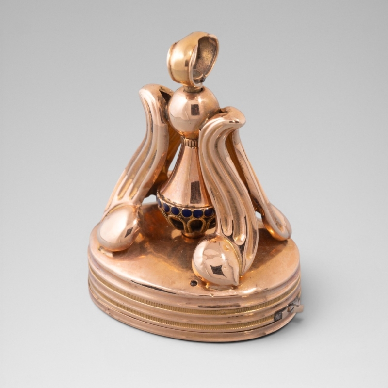 la monture est constituée d'une anse à décor de double volutes en " S " enserrant un élément central en forme de cloche orné d'une délicate frise en émail bleu à motif perlé. La base circulaire godronnée renferme un mécanisme musical miniature. Le remontage permettant le déclenchement de la mélodie s'effectue par rotation de l'anse.