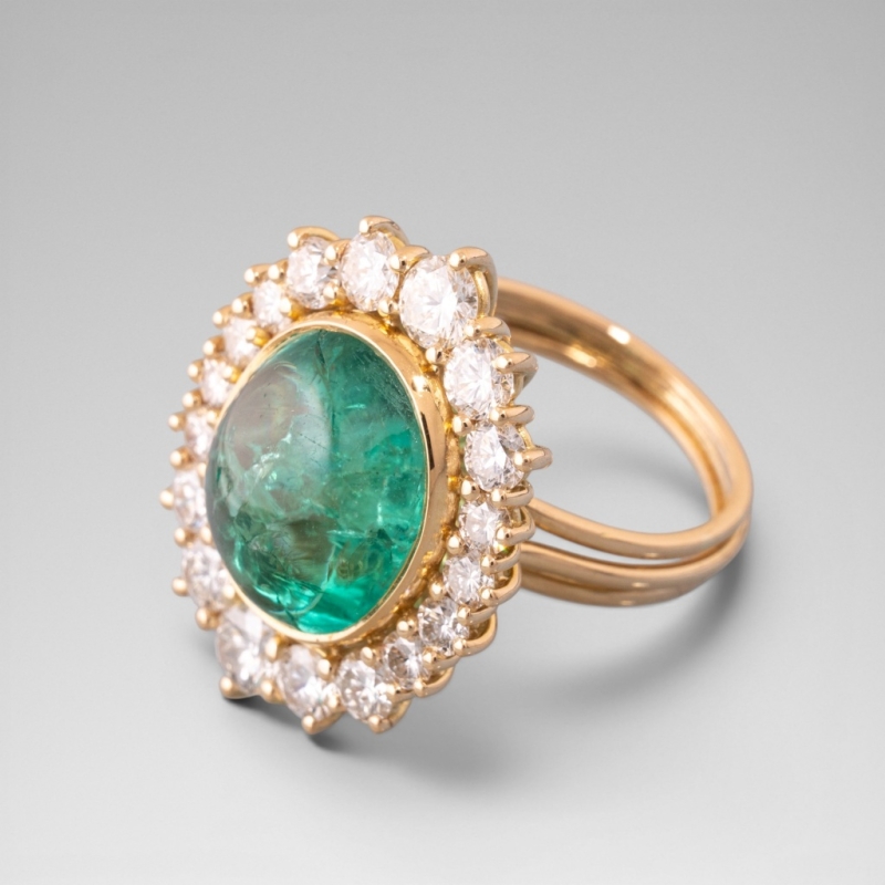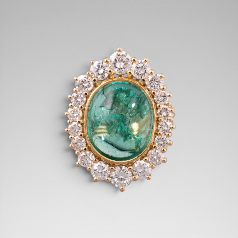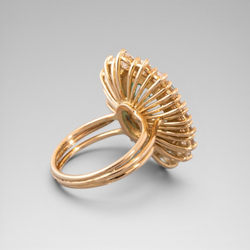 bague multi fils en or jaune 18k (750) sertie d'un important cabochon d'émeraude de Colombie entouré de diamants taille brillant disposés en chute.