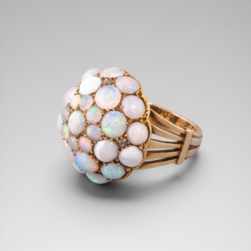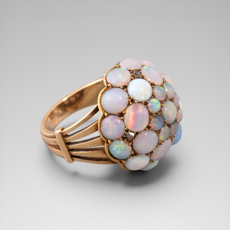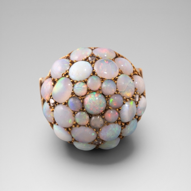 en or jaune 18K (750) entièrement sertie de cabochons d'opales de diverses couleurs et dimensions, quelques éclats diamantés ponctuent l'ensemble du motif.