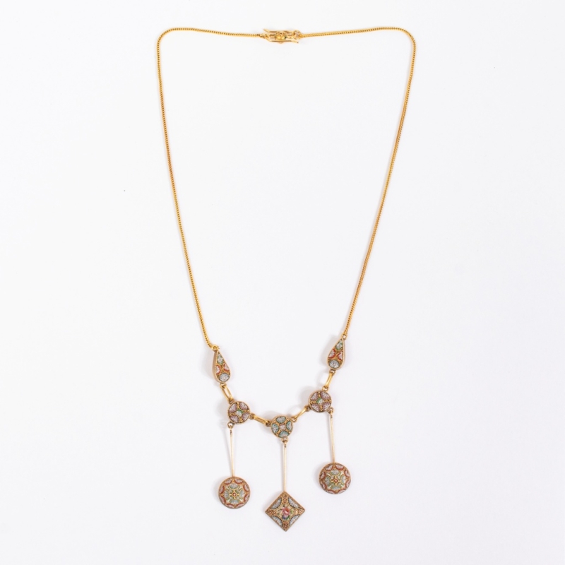 En or jaune 18K (750). Une chaîne maille serpent dotée d'un fermoir crochet filigrané, ornée de cinq éléments dont trois en pampille. Chaque élément est serti de micro mosaïque polychrome dessinant des motifs floraux d'une grande finesse.