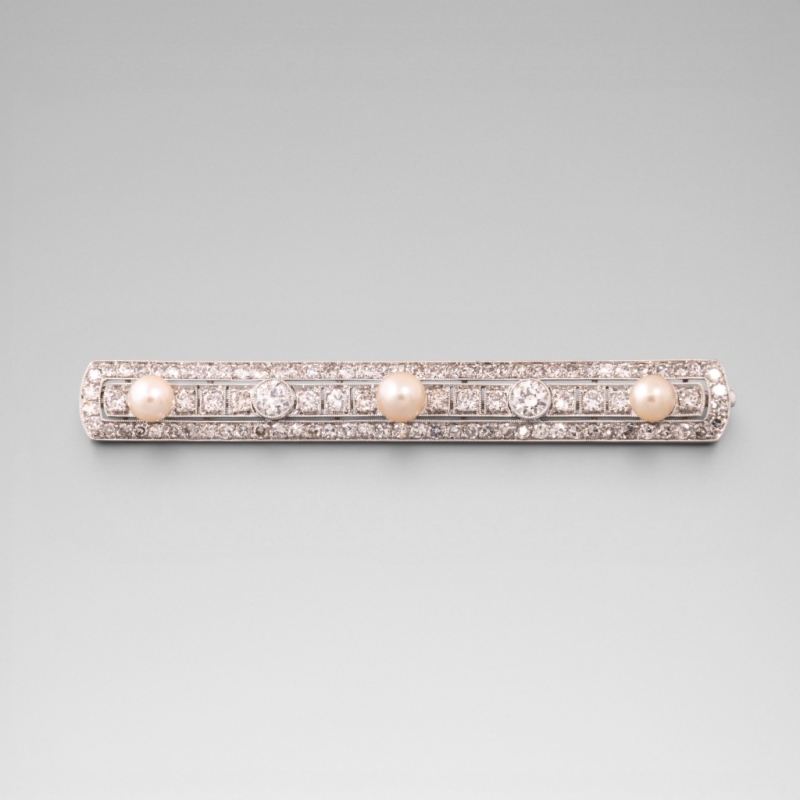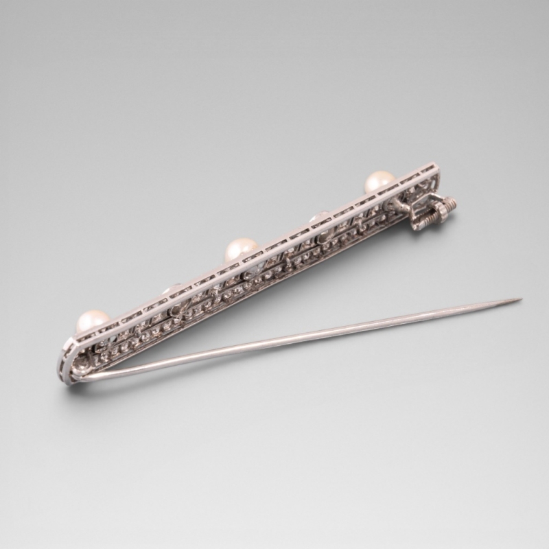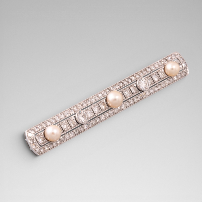 En platine, de forme rectangulaire aux extrémités arrondies, délicatement ajourée de motifs géométriques. Ornée au centre de trois perles blanches alternées de deux diamants taille brillant. l'ensemble de la monture est entièrement pavé de diamants taille brillant souligné par un travail de mille grain.
