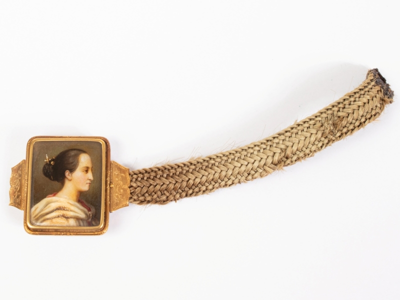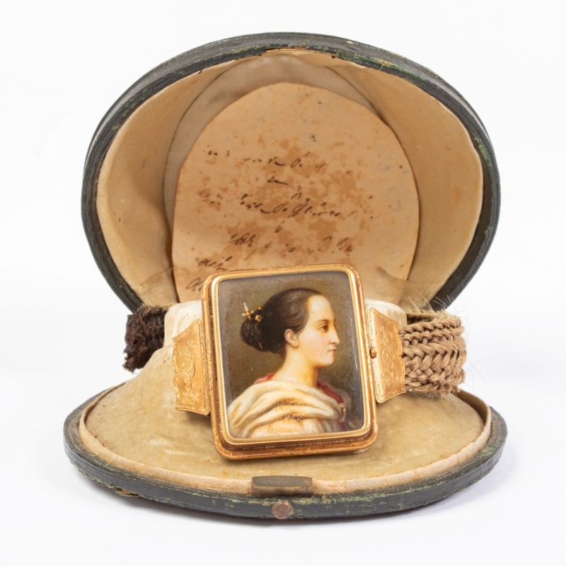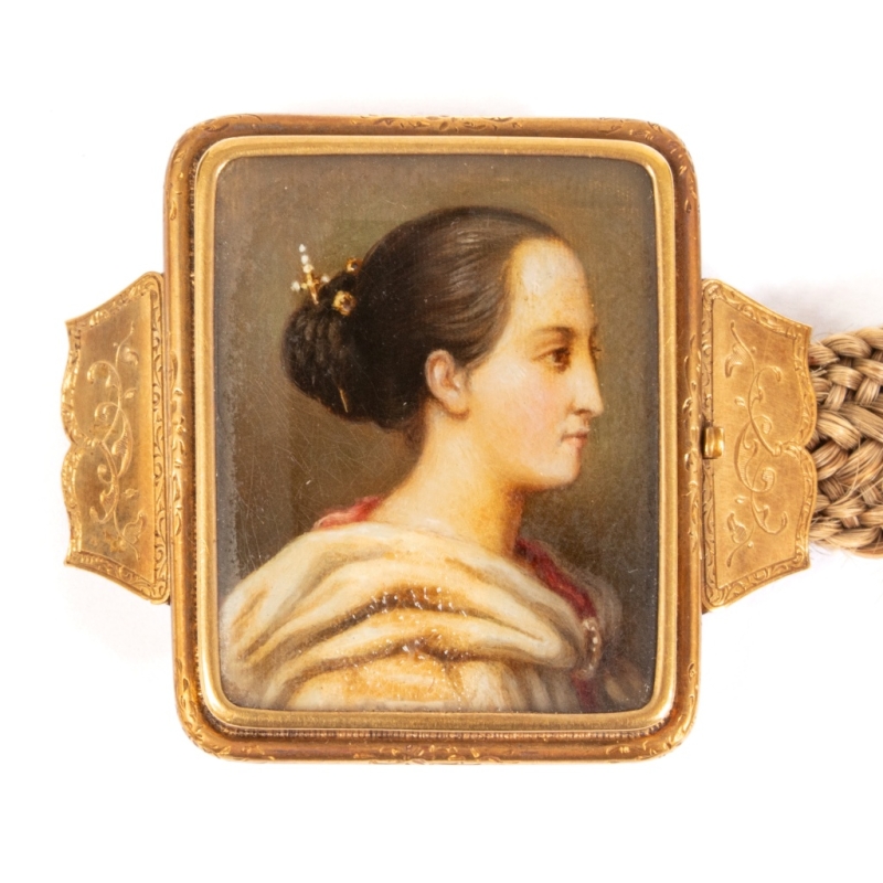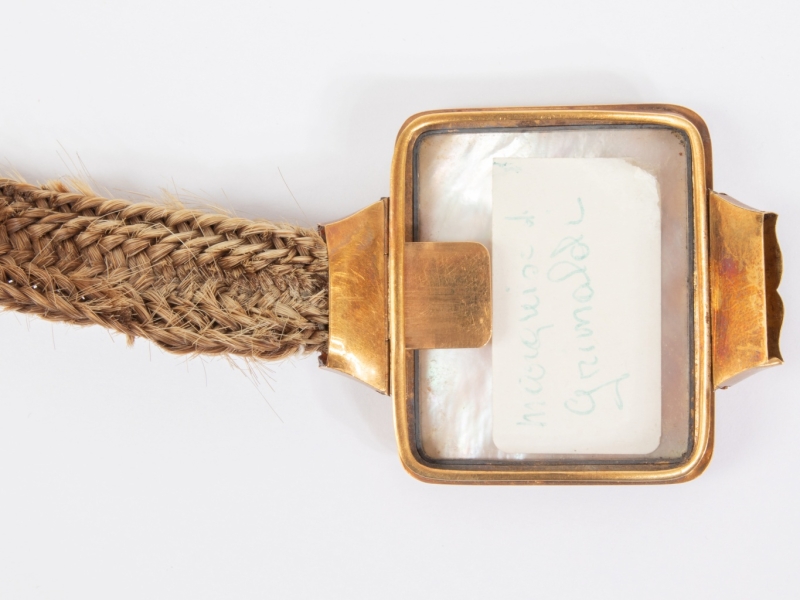 Rare et important bracelet constitué d'une bande de cheveux finement tressés, centré d'une miniature polychrome figurant le portrait d'une élégante identifiée comme la Marquise de Grimaldi par une note manuscrite au verso. L'avers du portrait est orné de nacre. Le pourtour les attaches et le fermoir sont en or rose 18k (750) habilement gravés de fleurs et volutes.